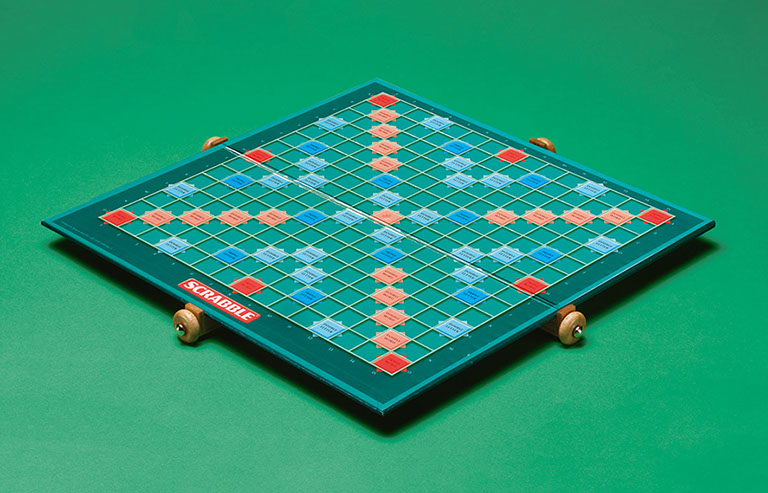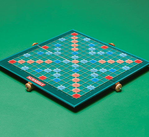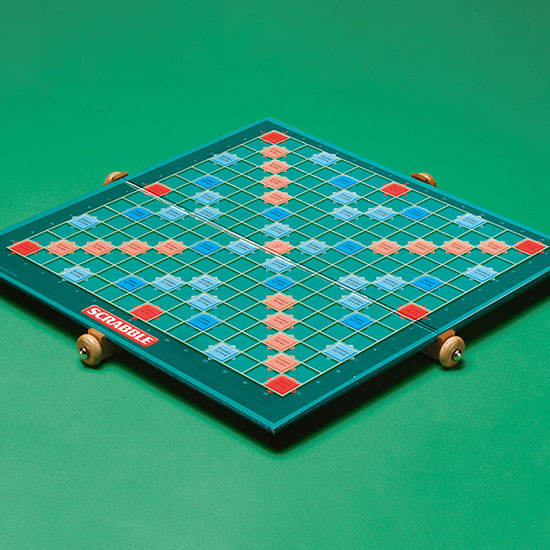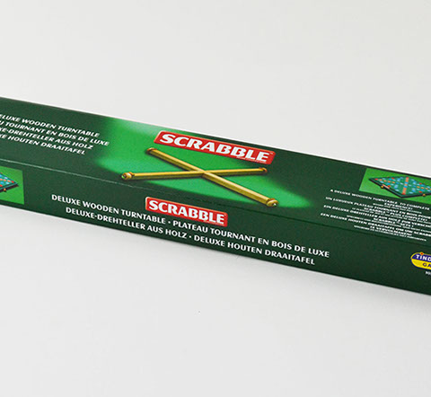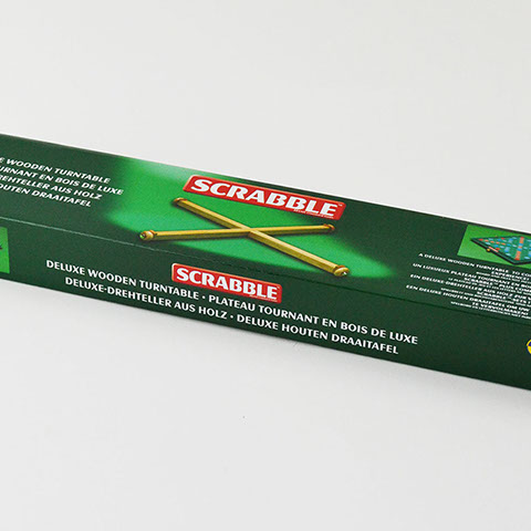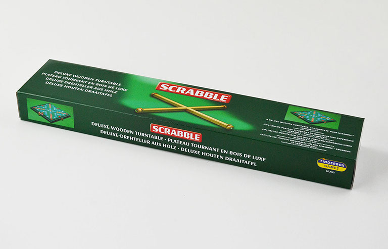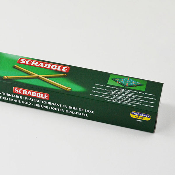 Deluxe wooden turntable holds all standard SCRABBLE boards. Board rotates smoothly so all players can participate equally.