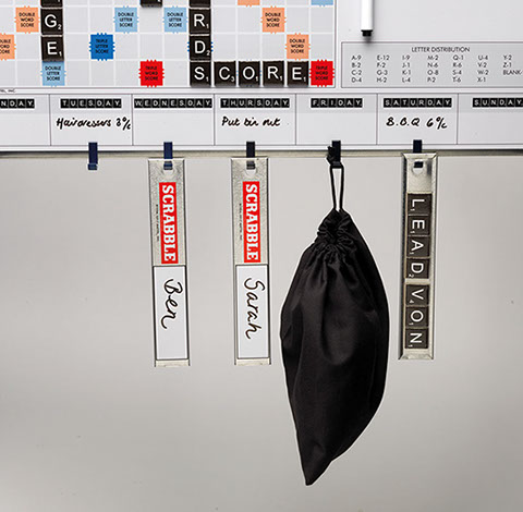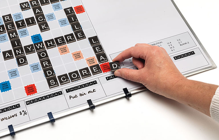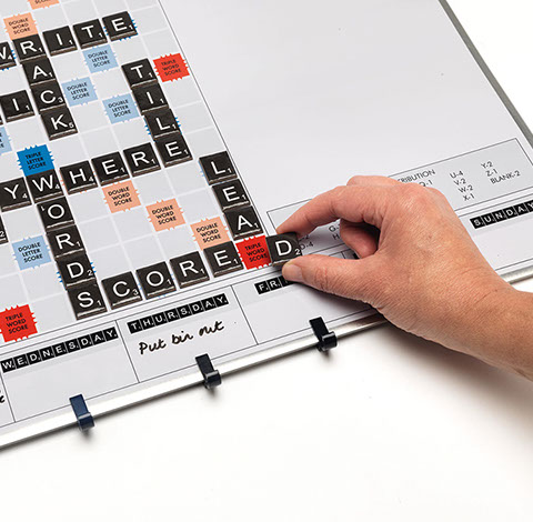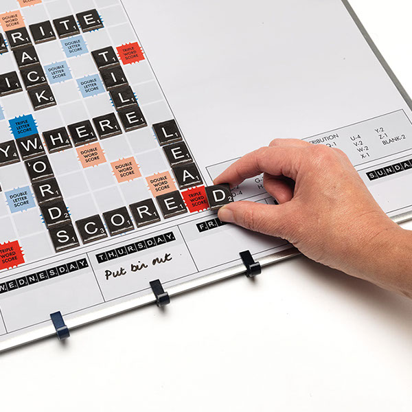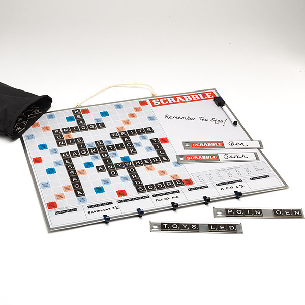 Wipe-clean magnetic board holds tiles in place, it also lets you keep score, and leave messages!